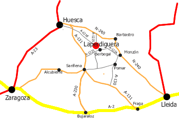 Laperdiguera se sitúa junto a la carretera A-1225, con buenos accesos desde Barbastro o Huesca, permitiendo unas comunicaciones cómodas y rápidas con las principales ciudades de España: